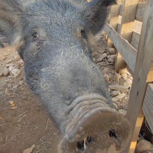 Hearing something about a piglet in the cattery of this same rescue, we went back and retrieved a very thin little piglet covered in mange. Fuzzbutt. Munch allowed him to cuddle up to him at night and gave Fuzzbutt the comfort he needed. They are inseparable now, Fuzzbutt is now taking care of Munch as he slowly loses his eyesight due to inbreeding.